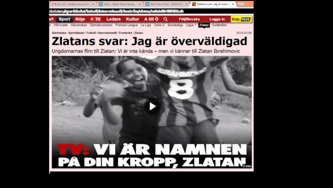 Big news! More than three of the most influential Swedish news sites have acknowledged Zlatan Ibrahimovic´s response to Wale Wale Kenya's video ”We are the names on your body”. Aftonbladet, the biggest news site in Sweden, wrote that “Zlatan Ibrahimovic called out to try to stop hunger in the world. Now he has been replied … Continue reading Media Coverage
